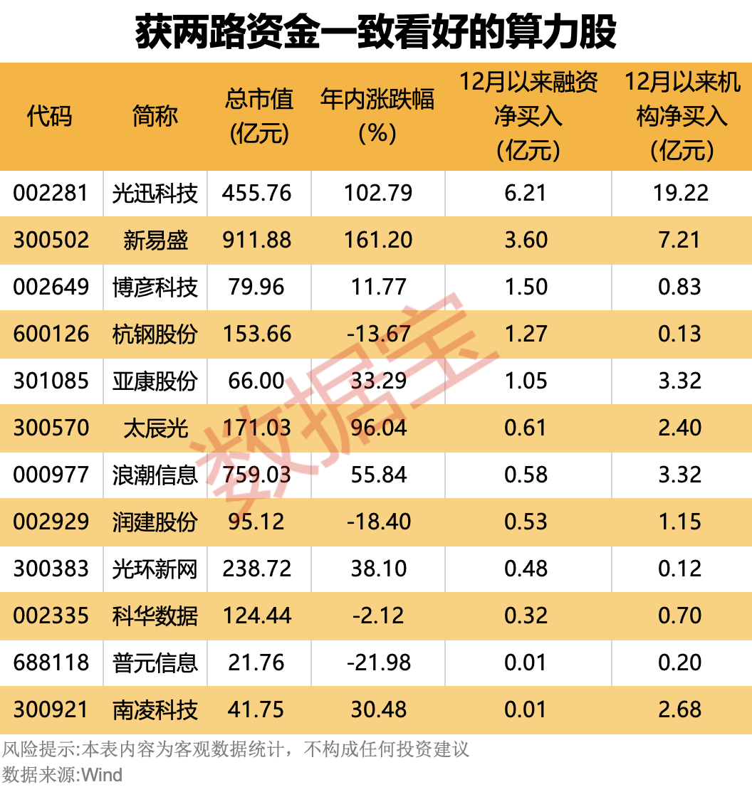 12月以来,算力产业链个股受到资金的高度关注。机构资金净买入光迅科技19.22亿元,新易盛、浪潮信息、亚康股份、寒武纪-U、太辰光等7股也均超1亿元。融资资金则大举加仓光迅科技、中际旭创、新易盛、天孚通信等10股超1亿元。