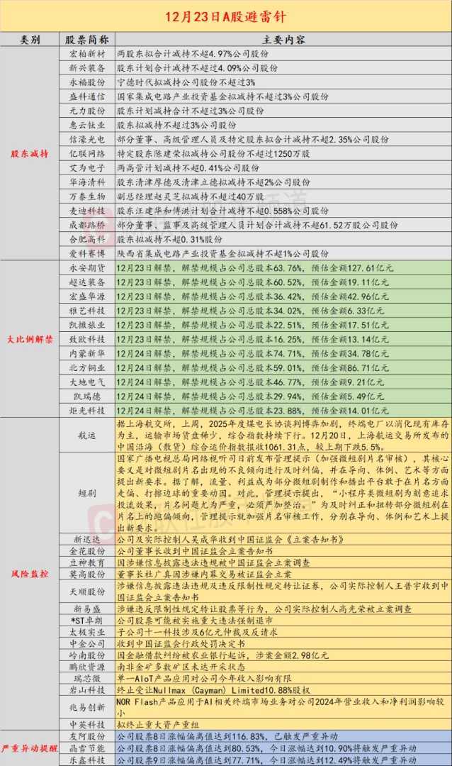 导读:财联社12月23日发布投资避雷针报告,揭示A股及海外市场潜在风险。国内经济方面,上海航交所显示商品市场博弈加剧,沿海综合运价指数大幅下滑;同时,微短剧片名审核加强,整治哗众取宠现象。公司预警方面,多家企业高管因内幕交易、信息披露违规等问题被证监会立案。海外市场方面,美股诺和诺德因新药试验不及预期大跌,比特币跌破93000美元,乌克兰计划停止转运俄罗斯天然气。