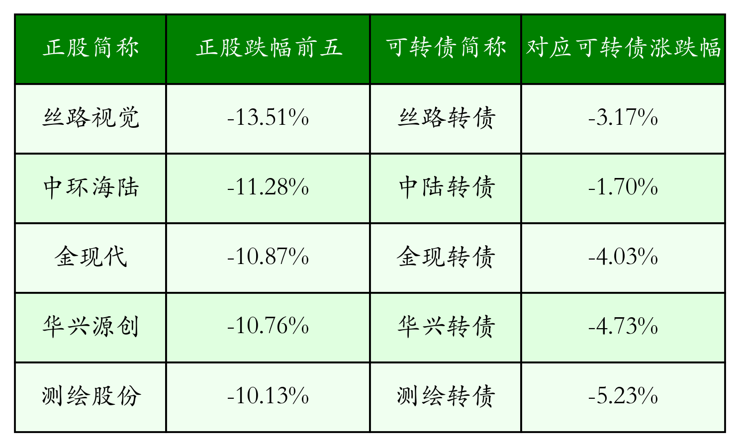 然而,市场下跌的态势同样明显,今日有154只可转债对应的正股跌幅超过5%。其中,华阳转债(128125)、帝欧转债(127047)、泉峰转债(113629)、灵康转债(113610)、塞力转债(113601)、华体转债(113574)和宏柏转债(111019)等可转债的跌幅分别达到了4.26%、4.31%、5.58%、3.35%、2.82%、2.51%和4.12%。