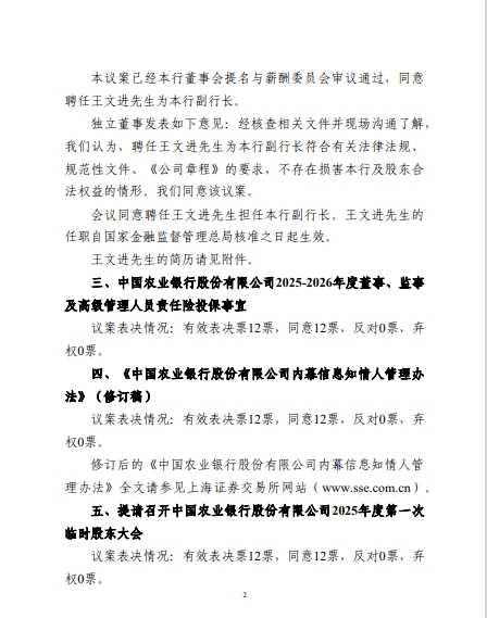 中国网财经12月24日讯 昨日,中国农业银行发布了一则重要的董事会决议公告,公告内容显示,该行董事会已正式同意聘任王文进先生担任农业银行副行长一职。此次人事任命标志着王文进先生将正式加入农业银行的高级管理团队,共同推动农业银行未来的发展。