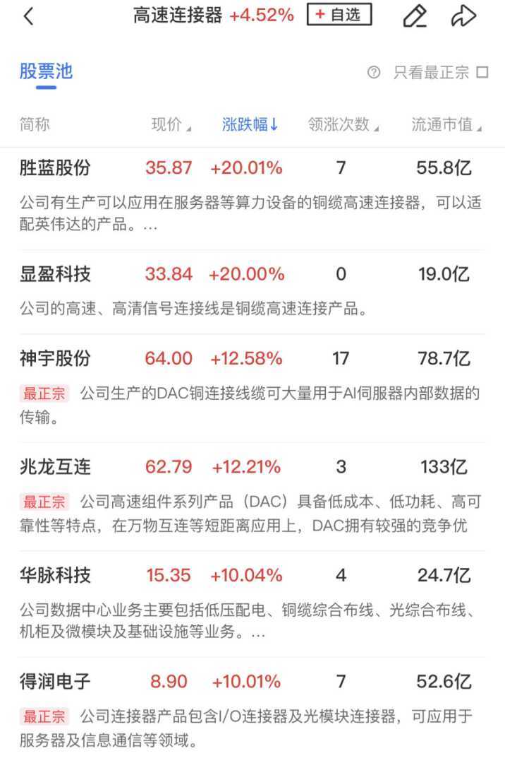 板块聚焦方面,铜缆高速连接器板块表现突出,胜蓝股份、显盈科技等个股20CM涨停,神宇股份、兆龙互连涨幅超过10%,得润电子、宝胜股份、华脉科技等个股也纷纷涨停。随着生成式人工智能(AIGC)技术的逐步成熟,算力需求持续攀升,光大证券研报指出,有源铜缆需求将迎来高增长,且趋势有望持续2-3年。