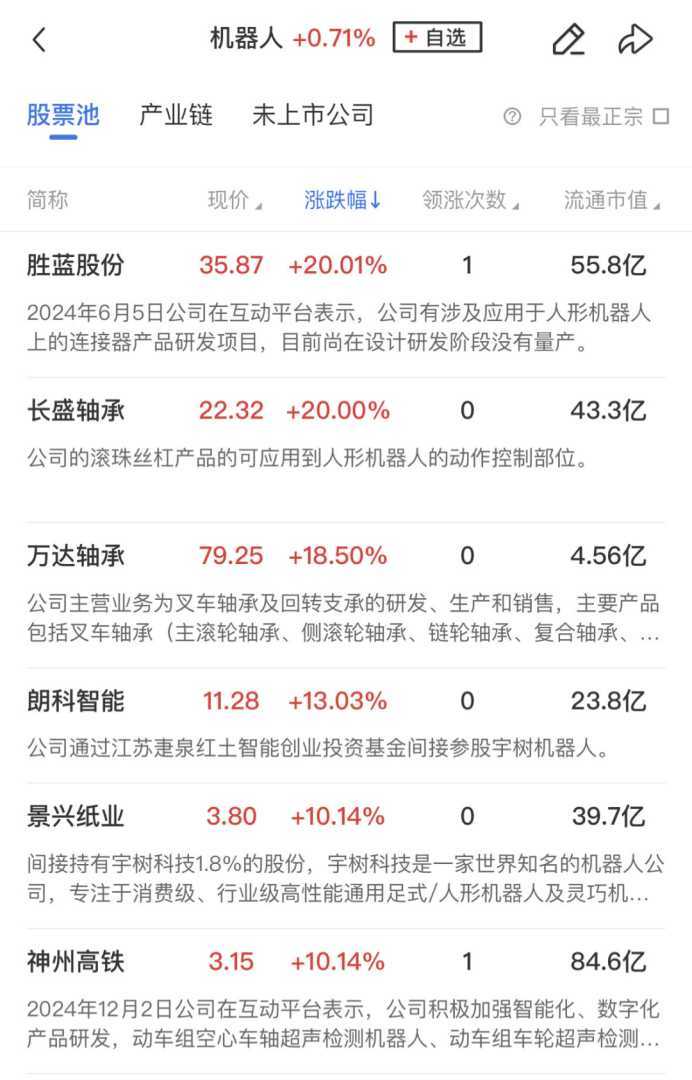 机器人概念股开盘后走强,长盛轴承、景兴纸业等个股涨停。近期,机器狗技术不断发展,宇树科技等厂商加速出货,推动机器狗在巡检、消防救援等领域的广泛应用。中信证券统计显示,2024年全球人形机器人出货数量将达到2000台以上,机器狗市场也预计将迎来爆发式增长。