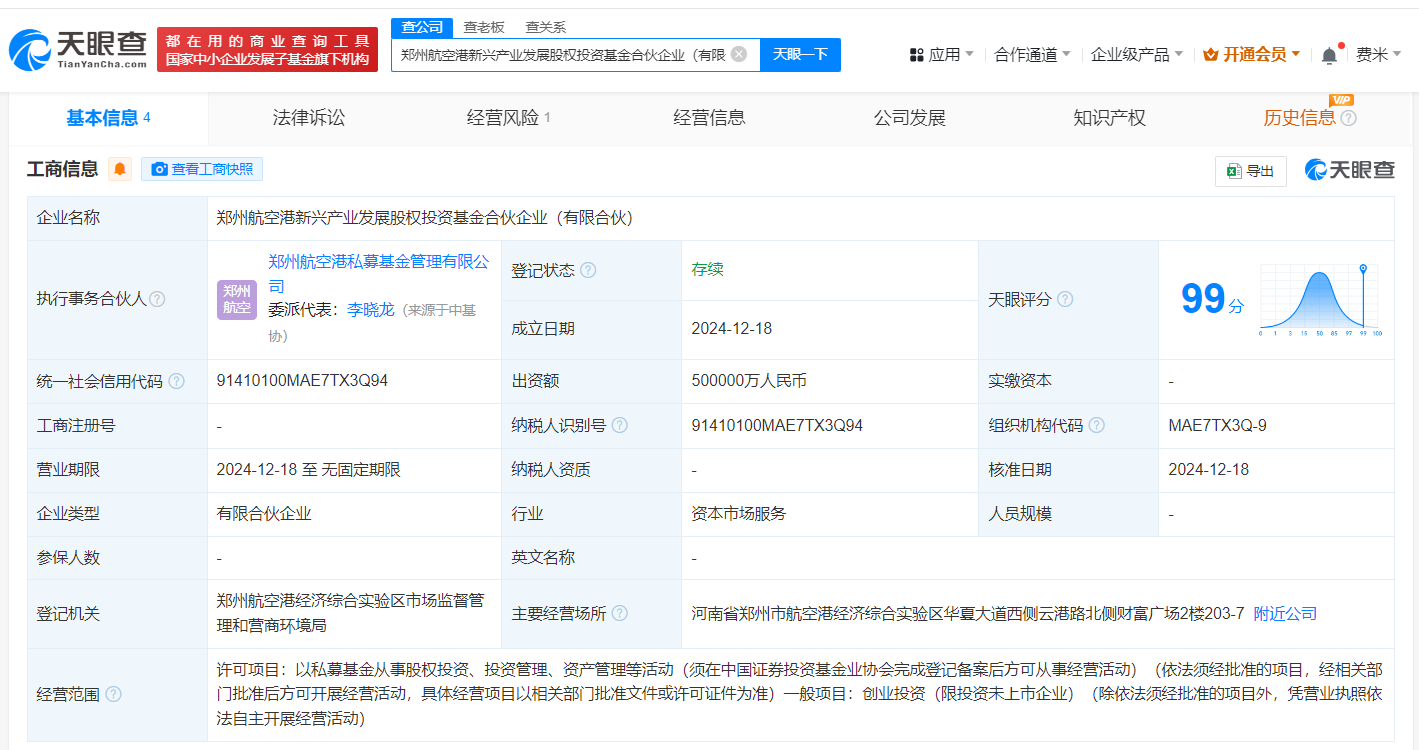 郑州航空港新兴产业发展股权投资基金合伙企业近日成立,注册资本50亿元,由多家实力公司共同出资,专注于创业投资及私募基金管理等活动。