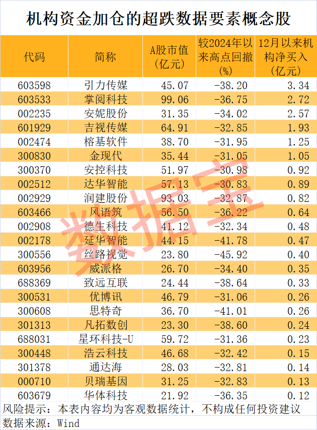 尽管如此,数据宝统计显示,12月以来,仍有23只回撤幅度超30%的数据要素概念股获得机构净买入逾千万元,其中引力传媒、掌阅科技等6股获机构净买入超亿元。