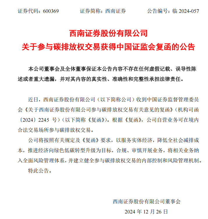 12月25日,西南证券发布公告称,公司已收到证监会复函,允许其自营业务在境内合法交易场所参与碳排放权交易。西南证券表示,将严格按照相关规定及复函要求,以服务实体经济、降低全社会减排成本、推进经济向绿色低碳转型升级为目标,合规、审慎地开展业务,并将相关业务纳入全面风险管理体系,建立健全参与碳排放权交易的内部控制和风险管理机制。