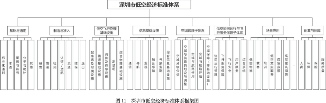 低空经济发展离不开低空新型基础设施建设、空域管理、场景搭建等多个方面。《指南(V1.0)》根据行业管理现状、产业结构特性及参与要素构成,将深圳市低空经济标准体系划分为基础与通用、制造与准入、低空飞行物理基础设施、信息基础设施、空域管理、低空协同运行与飞行服务、场景应用、配套与保障八大一级子体系。