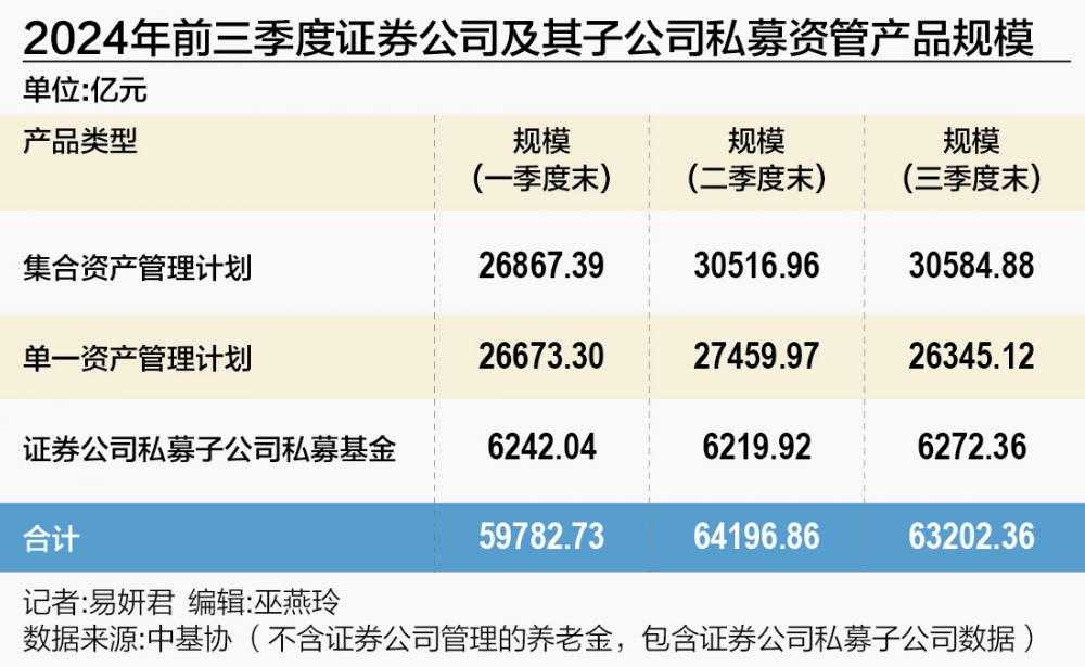 根据中基协数据,截至2024年三季度末,证券公司及其子公司私募资产管理产品规模6.32万亿元(不含证券公司管理的养老金,包含证券公司私募子公司数据),其中,券商集合资产管理计划规模30584.88亿元,占比约48%;券商单一资产管理计划规模26345.12亿元,占比约42%。相比一年前,集合资产管理计划规模及占比均有所提升。
