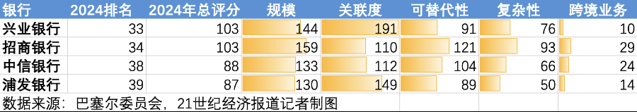21世纪经济报道记者深入对比了各项分值,发现我国股份制银行在“资产规模”方面与入选的国内外银行相差不大,但在“复杂性”和“跨境业务”这两个分项上存在显著差距。2023年中国系统重要性银行(D-SIBs)名单中,兴业、招行与交行同组,但仅交行入选全球名单,或与国内名单未设置“跨境”一级指标有关。