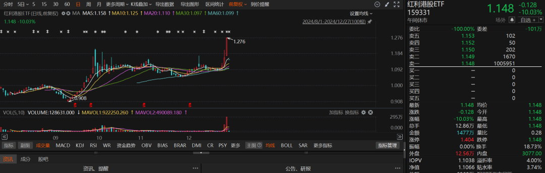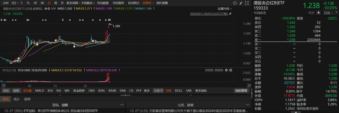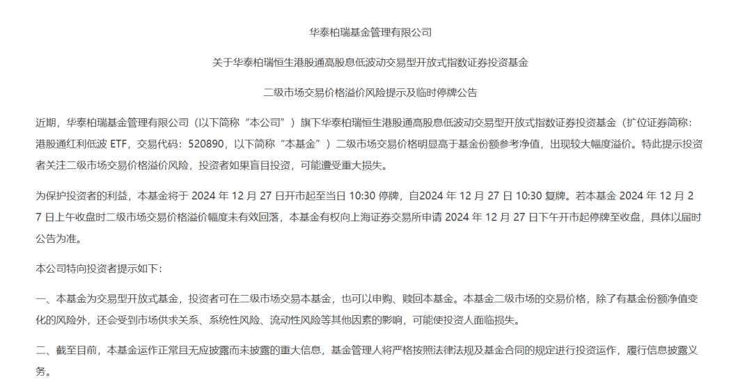 具体来看,12月26日,华泰柏瑞港股通红利低波ETF涨停,基金公司紧急发布溢价风险提示公告。12月27日,该ETF复牌后即快速跌停。类似的情况也在国泰红利港股ETF和万家港股央企红利ETF上演。