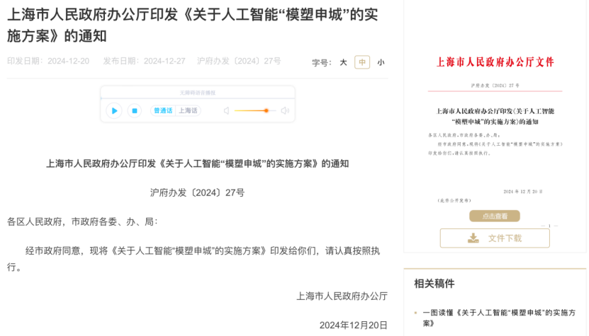 上海市政府发布《关于人工智能“模塑申城”的实施方案》和《上海市推动银发经济高质量发展若干政策措施》,旨在打造世界级人工智能产业生态和推动银发经济高质量发展。
