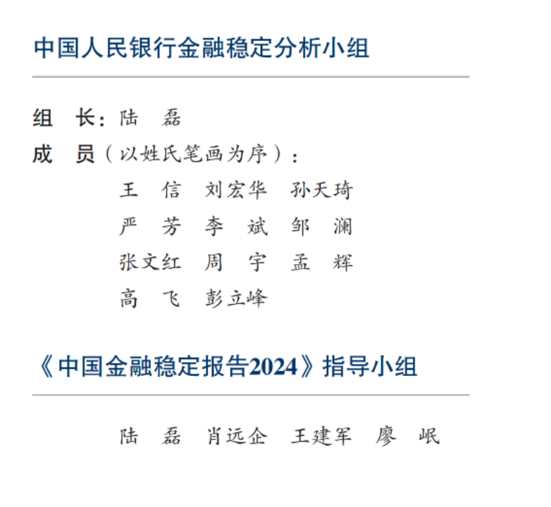 值得注意的是,此次报告的作者团队,即央行金融稳定分析小组,经历了较大的人事更迭。组长由2023年的央行副行长宣昌能变更为另一位央行副行长陆磊,成员名单也进行了大幅度调整,包括央行研究局局长王信、央行办公厅主任刘宏华、央行金融稳定局局长孙天琦等多位重量级人物。