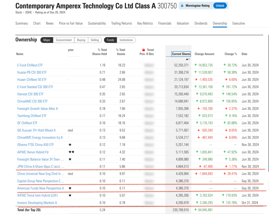 然而,在股价大幅上涨后,部分外资机构亦对持仓进行了调整。11月,部分外资基金小幅减持宁德时代。例如,摩根资产管理旗下JPMorgan Funds - China A-Share Opportunities Fund在11月减持宁德时代1.77%。此外,安联投资旗舰基金Allianz Global Investors Fund - Allianz China A Shares和安本投资旗下的abrdn SICAV I - China A Share Sustainable Equity Fund亦在11月分别减持宁德时代8.94%和6.53%。尽管如此,减持后宁德时代依然是这些基金的重仓股之一。