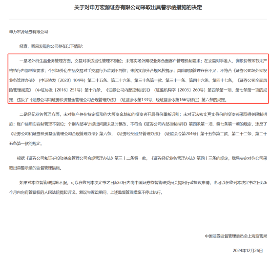 申万宏源证券因场外衍生品业务和经纪业务的违规事项被上海证监局采取出具警示函措施,违规行为涉及交易对手适当性管理不到位、未落实场外期权业务负面客户管理机制要求、风险限额管理存在不足等六项,触及的条例多达十条。国信证券则因场外衍生品业务存在为客户违规开展业务提供便利、适当性核查不完善等问题,被深圳证监局责令改正。银河证券也因衍生品业务和经纪业务违规,被北京证监局采取出具警示函的行政监管措施。