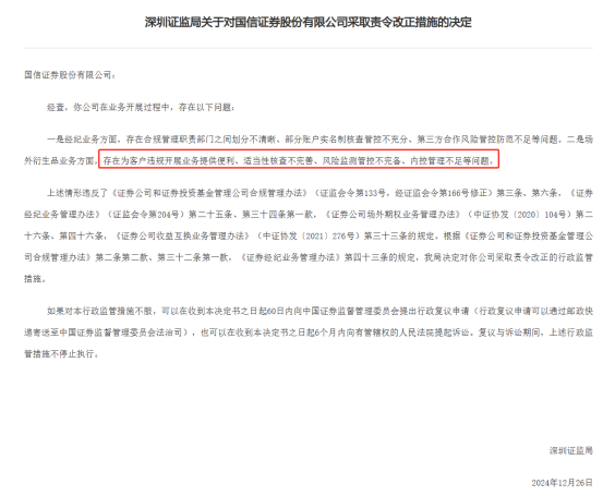 深圳证监局关于对国信证券采取责令改正措施的决定。