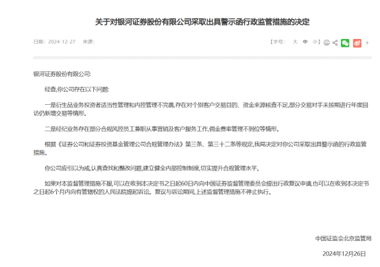 关于对银河证券采取出具警示函行政监管措施的决定。