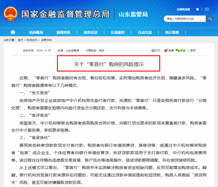 山东金融监管局指出,“零首付”购房通常涉及房地产开发企业或中介机构垫付首付款,购房者需分期偿还垫付款项及额外利息和手续费;或联合购房者做高购房合同价格,向银行贷出更多款项覆盖首付款,购房者需支付更多中介费和税费;或挪用其他种类贷款支付首付款,涉及伪造虚假交易背景、账户流水等违规操作。