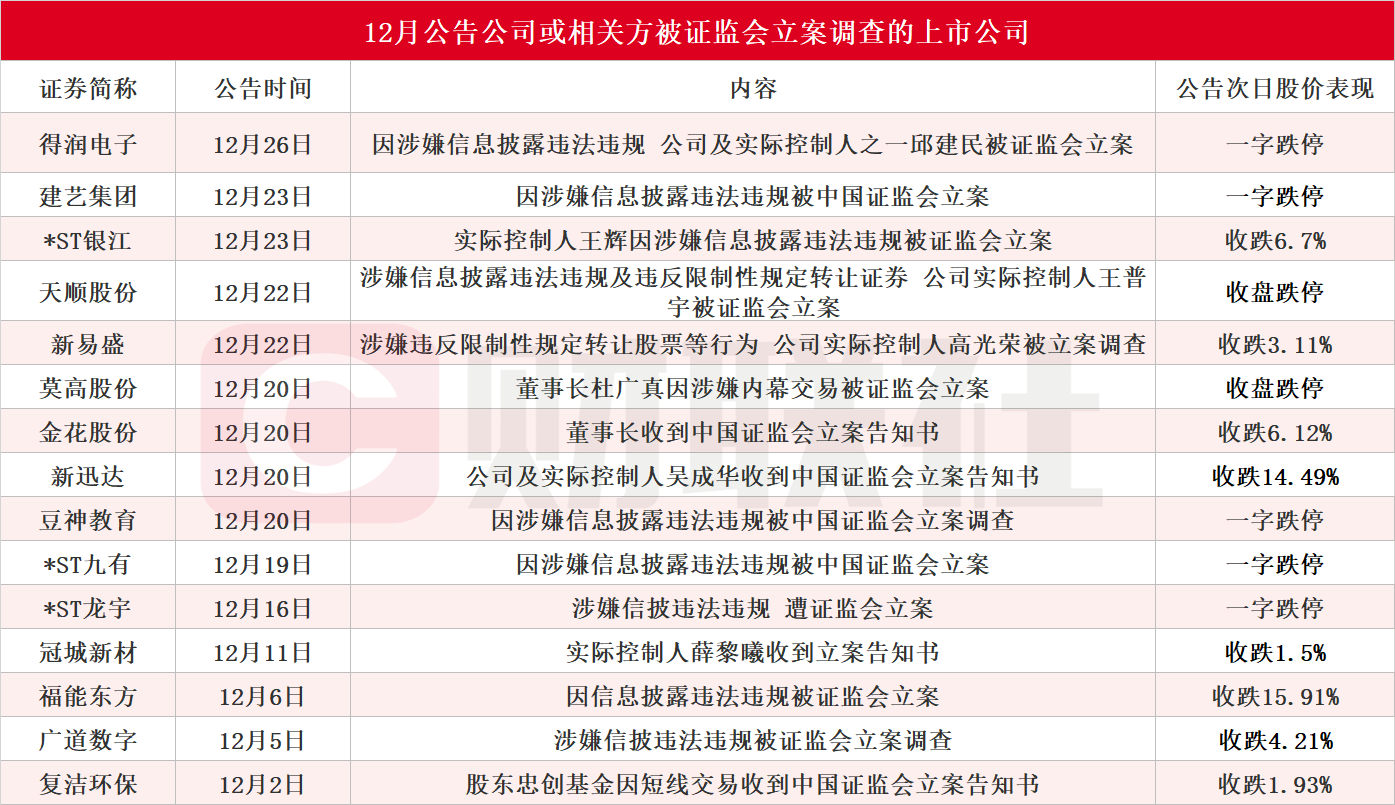 12月多家A股上市公司及相关方因信息披露违规被立案调查,次日股价剧烈波动,其中五家公司一字跌停。