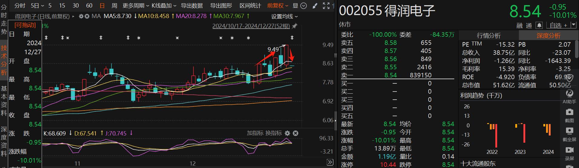 得润电子主营电子连接器和精密组件的研发、生产及销售。12月26日公告显示,公司及实际控制人之一邱建民因涉嫌信息披露违法违规被立案调查。同时,公司控股股东深圳市得胜资产管理有限公司所持公司股份10.72万股将被司法拍卖。此前,深圳证监局已对公司采取责令改正措施,指出公司定期报告披露的应收款项收回情况与实际不符,相关年度财务报告数据不准确等问题。二级市场方面,得润电子在立案公告披露当日录得6天3板,次日则一字跌停,封单超80万手。