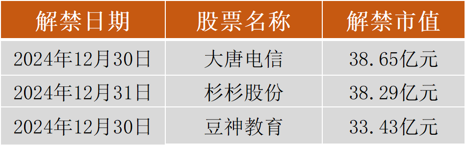 在股市方面,本周A股解禁市值超328亿元,沪深两市共有65家公司限售股陆续解禁,合计解禁量40.03亿股。其中,大唐电信、杉杉股份、豆神教育解禁市值居前三位。