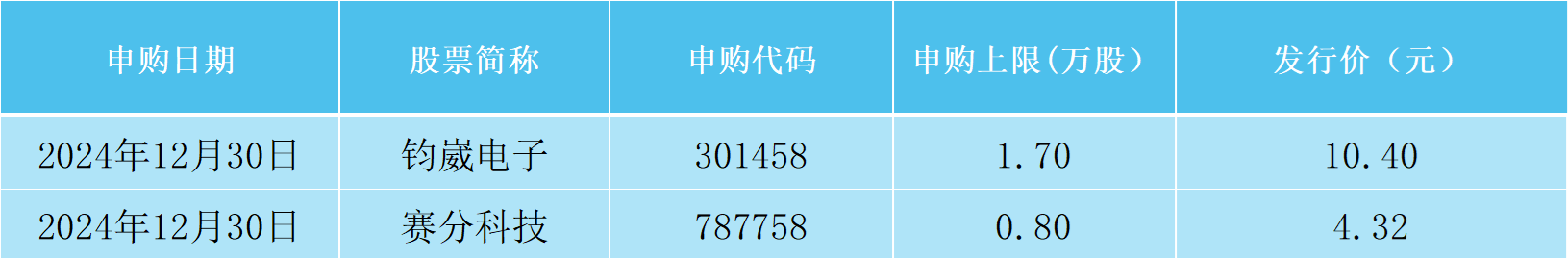 在新股申购方面,本周有2只新股申购,分别是创业板新股钧崴电子、科创板新股赛分科技,成为2024年最后一拨新股。