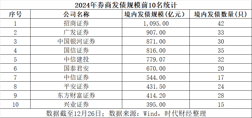 在单个券商层面,招商证券以1095亿元的债券发行规模位居首位,成为今年唯一一家发债超千亿元的券商。相比之下,2023年发债规模超千亿元的中信证券,今年发债规模降至544亿元,显示出券商间发债规模的显著差异。
