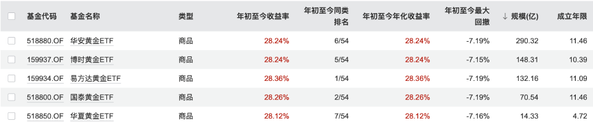黄金ETF也是年内备受追捧的投资产品之一。以实物黄金为依托、在交易所上市的开放式基金黄金ETF,年初至今收益率均超过28%。多只黄金ETF规模实现大幅增长,备受投资者青睐。