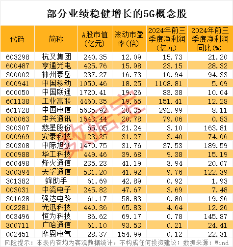 A股市场方面,涉及5G概念的股票达400只,总市值6.62万亿元。今年以来,多家产业链龙头股获得机构高频调研,其中深南电路年内累计获调研78次。从业绩情况来看,过去三年及今年前三季度,净利润均实现正增长的5G概念股有21只,滚动市盈率低于30倍的有9只,包括杭叉集团、亨通光电等。