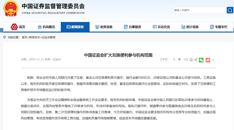 此次,证监会在首批20家参与机构的基础上,依据分类评价、合规风控等严格标准,增选了另外20家机构,形成了40家备选机构池。在每次操作时,将结合意向参与规模精心筛选出约20家机构参与央行的招标操作。目前,第二次互换便利操作的所有前期准备工作均已完成,并于今日正式实施。