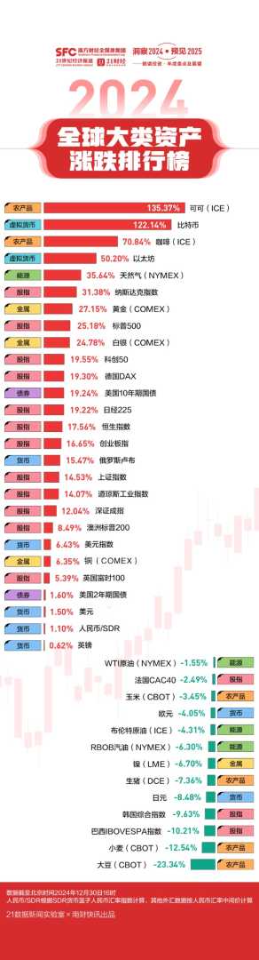 回顾2024年,投资市场风云变幻。ICE市场上的可可、咖啡期货全年保持上涨,可可期货涨幅超130%;比特币价格屡创新高,于12月5日突破10万美元/枚;黄金价格亦迎来强势上涨,纽约期金价格累计上涨27%,至2637美元/盎司。投资者在寻求资产增值的过程中,面临诸多机遇与挑战。