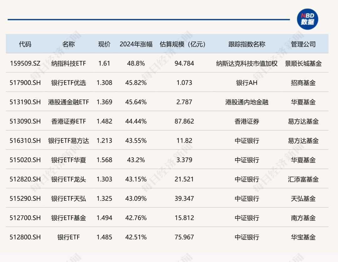 此外,招商基金旗下的银行ETF优选、华夏基金旗下的港股通金融ETF、易方达基金旗下的香港证券ETF及银行ETF易方达等五只ETF,2024年涨幅均超40%,分别录得45.82%、45.64%、44.44%和43.55%的佳绩。