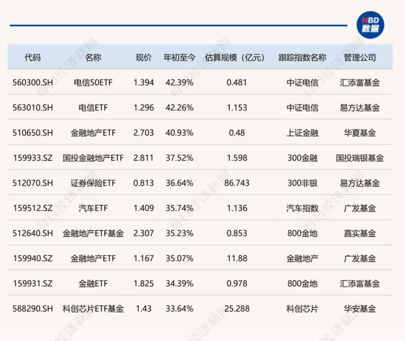 行业ETF方面,银行ETF易方达以43.55%的涨幅位列榜首,前十名多为跟踪中证银行指数的ETF,涨幅均超40%。主题ETF中,汇添富基金旗下的电信50ETF以42.39%的涨幅领先,易方达旗下的电信ETF紧随其后,涨幅达42.26%。华夏基金旗下的金融地产ETF涨幅亦超40%。