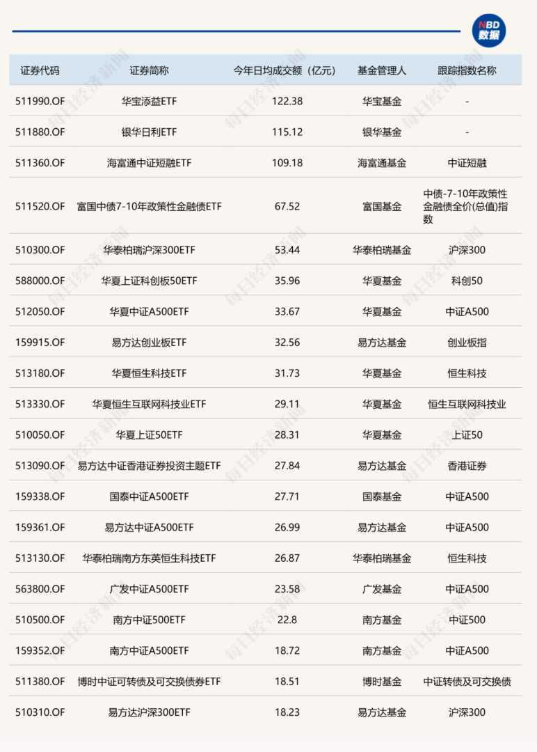 ETF日均成交额方面,华宝添益ETF和银华日利ETF两只货币ETF位居前列,日均成交额均超百亿元。海富通中证短融ETF日均成交额亦超百亿元,达109.18亿元。股票型ETF中,华泰柏瑞沪深300ETF、华夏上证科创板50ETF、华夏中证A500ETF等多只宽基ETF日均成交额名列前茅,均超30亿元。