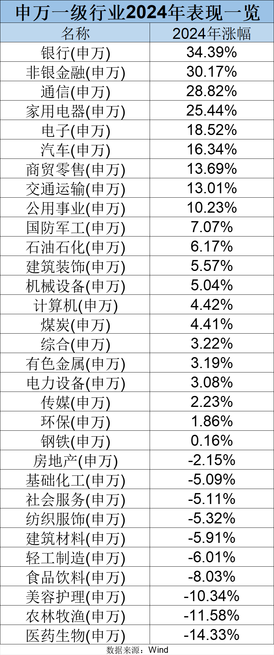 主动权益类基金整体表现平稳,净值增长率为3.87%。从板块表现看,银行业表现最佳,涨幅达34.39%,非银金融、通信、家用电器等涨幅也超25%,而医药生物、农林牧渔、美容护理等板块跌幅超10%。Wind数据显示,2024年权益基金整体获得5.63%的净值增长率,纳入统计的主动权益基金整体平均获得3.87%的净值增长率,普通股票型基金、偏股混合型基金净值增长率分别为3.96%、3.48%。指数基金更能把握市场暴涨行情,2024年净值增长率达10.87%,表现优于主动权益基金。