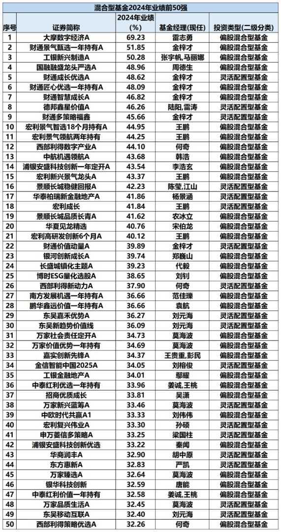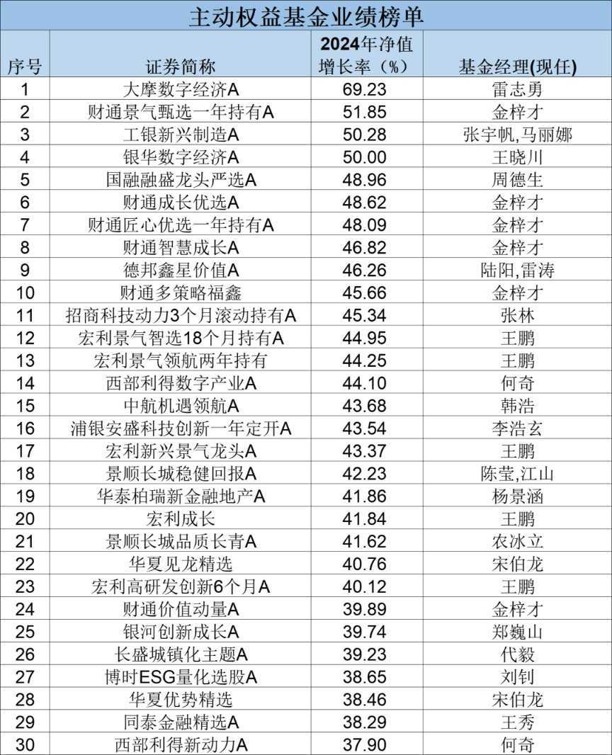 2024年共有1170只主动权益基金净值增长率超10%,其中271只超20%,74只超30%,4只超50%,最牛基金净值增长率逼近70%。雷志勇管理的大摩数字经济A以69.23%的业绩夺得主动权益类基金冠军,也是全部基金的年度业绩冠军。金梓才管理的财通景气甄选一年持有A获得亚军,净值增长率达51.85%。此外,张宇帆和马丽娜管理的工银新兴制造A,以及王晓川管理的银华数字经济A,净值增长率均超50%。