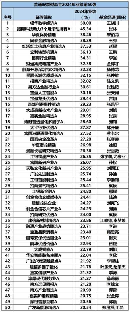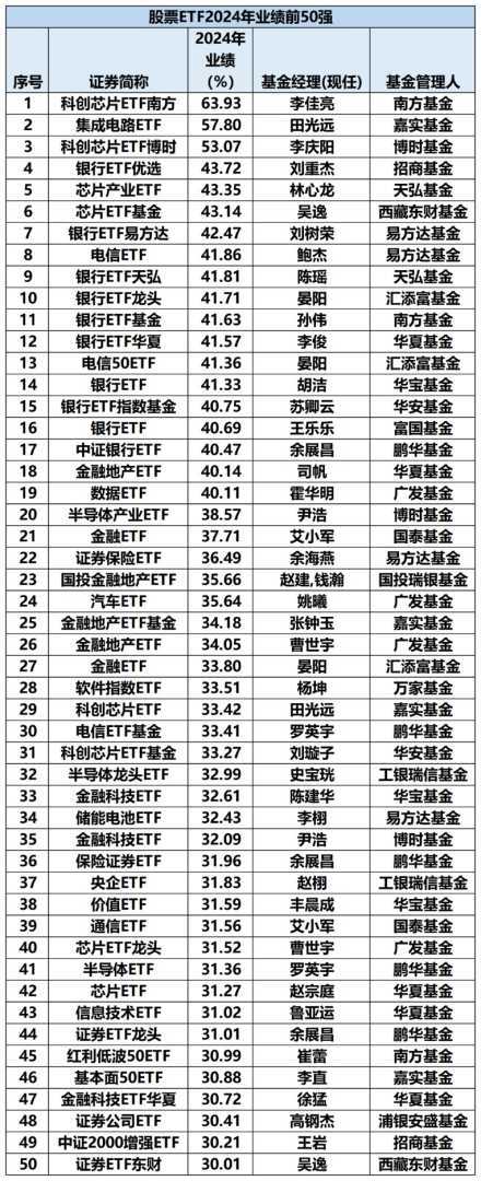 普通股票型基金中,王晓川管理的银华数字经济A2024年净值增长率达50%,位列第一。混合型基金中,雷志勇管理的大摩数字经济A位列第一,净值增长率达69.23%。股票ETF方面,芯片、银行等相关产品表现突出,南方科创芯片ETF业绩高达63.93%,位居第一。