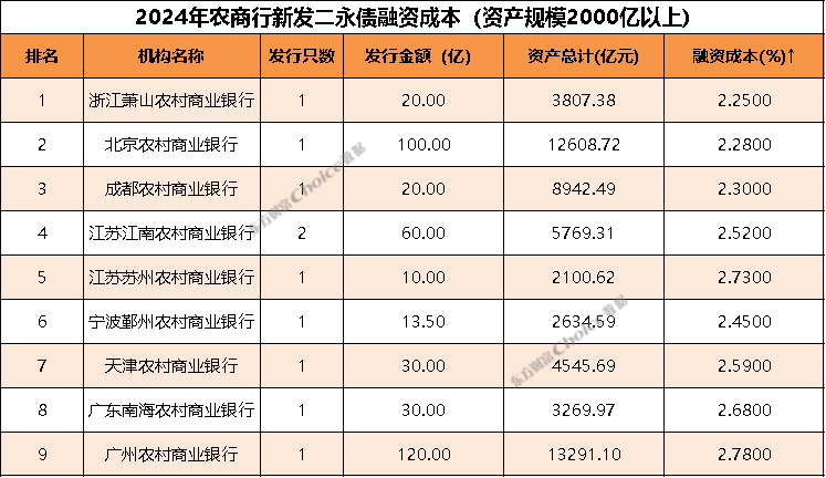 此外,农商行中,资产规模超2000亿的农商行中,广东南海农村商业银行新发二永债融资成本较低。整体来看,银行二永债市场在2024年呈现出稳健发展的态势。