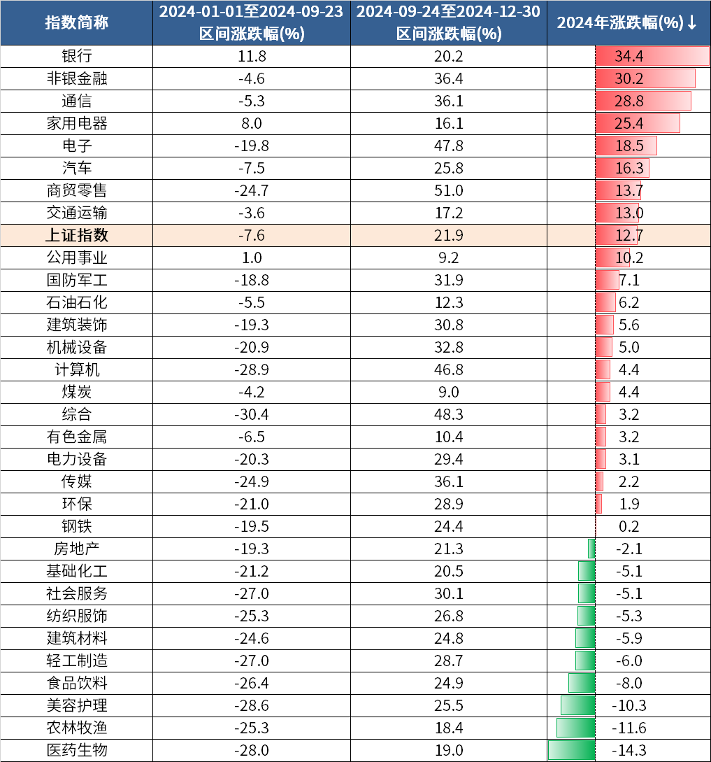 此外,周期思维也是投资者必须掌握的重要工具。世间没有永恒增长的赛道,只有不变的周期思维。正是由于周期的客观存在,决定了优质资产、安全边际、拉长久期的策略始终有效。2024年,银行板块成为涨幅第一的行业,全年上涨34%,几乎成为A股账户收益的“胜负手”。这背后,是银行股在经历连跌四年后,伴随着优质资产的稀缺和“高股息+中特估”的新叙事,重塑了价值认知。