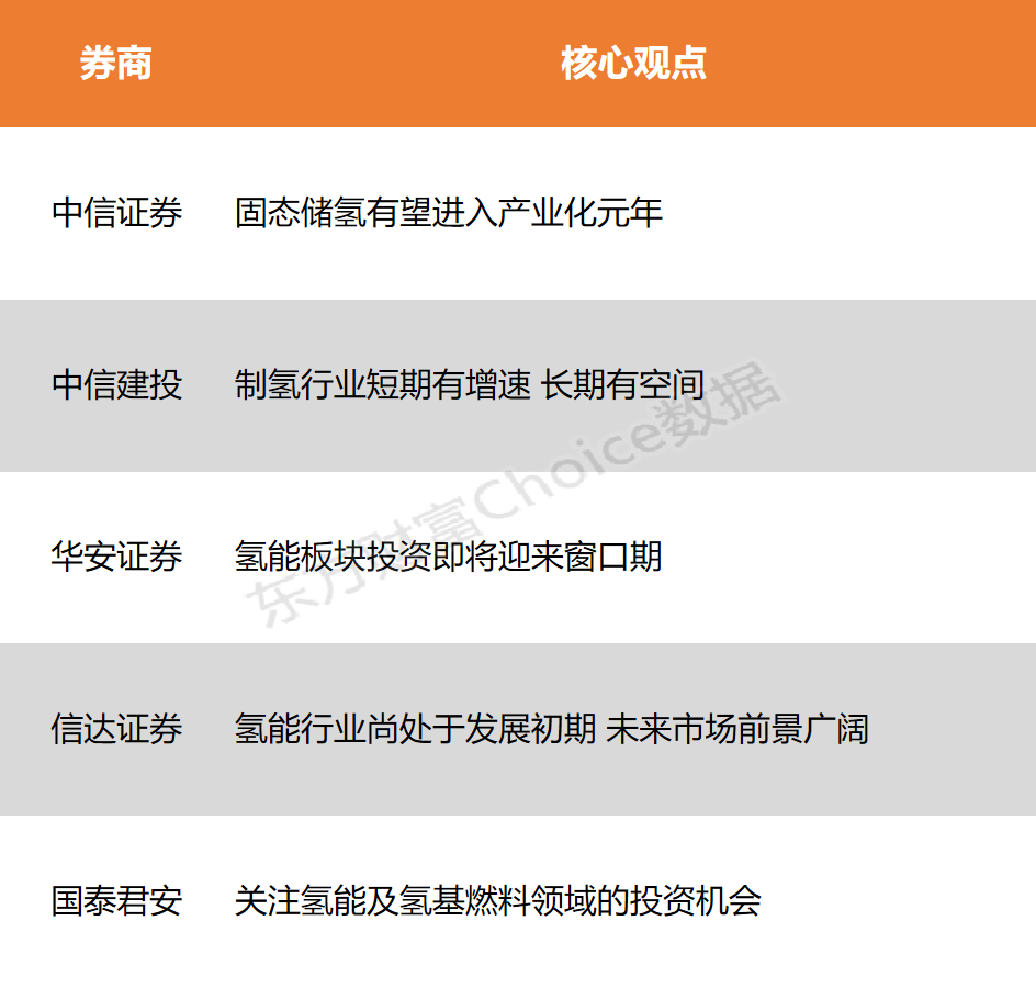 中信证券指出,固态储氢材料市场空间有望充分打开,产业化进程将加速推进。中信建投则表示,制氢行业短期内有增速,长期来看发展空间巨大。华安证券认为,氢能产业在政策扶持和市场需求双重驱动下,正呈现出快速发展的态势,氢能板块投资将迎来窗口期。