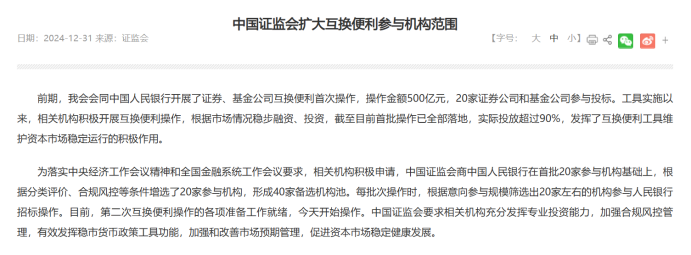 第二次互换便利操作的成功启动和招标完成,标志着互换便利工具正式迈入实质操作阶段。自2024年10月18日央行和证监会联合印发通知启动互换便利操作以来,在不到三个月的时间内,互换便利工具已实现了从政策发布到实质操作的快速落地。首次操作在工具推出后的一个月内就迅速官宣,规模为500亿元,机构参与积极。目前,首批操作已全部落地并完成投放,为资本市场的稳定运行提供了有力支持。