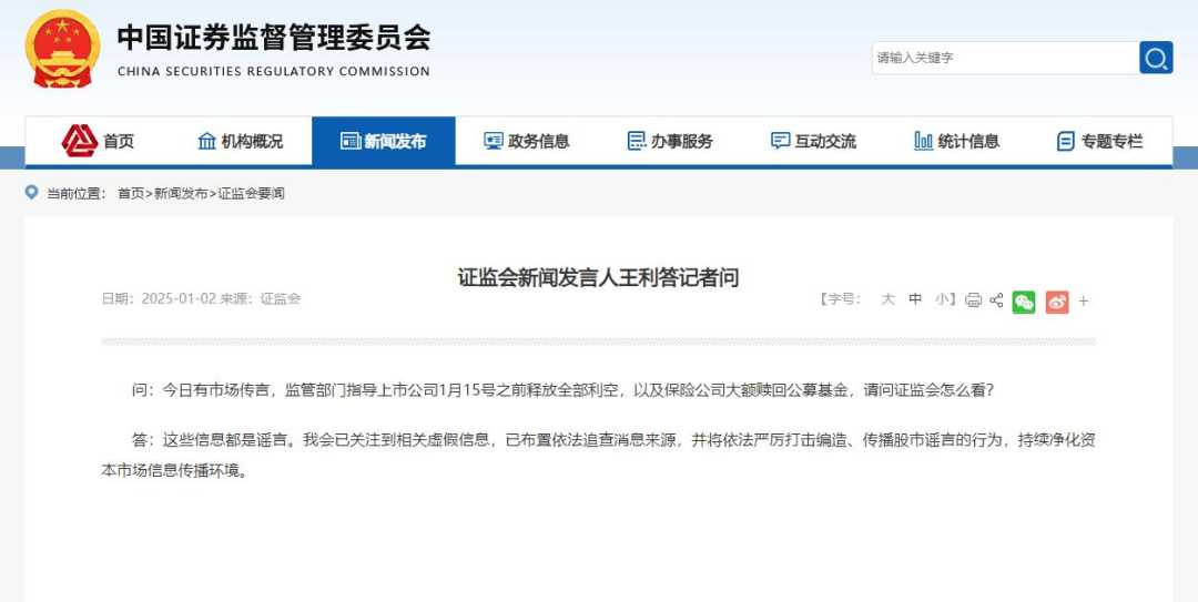 1月2日,市场传言四起,称监管部门要求上市公司在1月15日前释放所有利空消息,并且保险公司将大额赎回公募基金。然而,中国证监会新闻发言人王利于当日迅速回应,明确否认了这些信息的真实性,直指其为谣言。