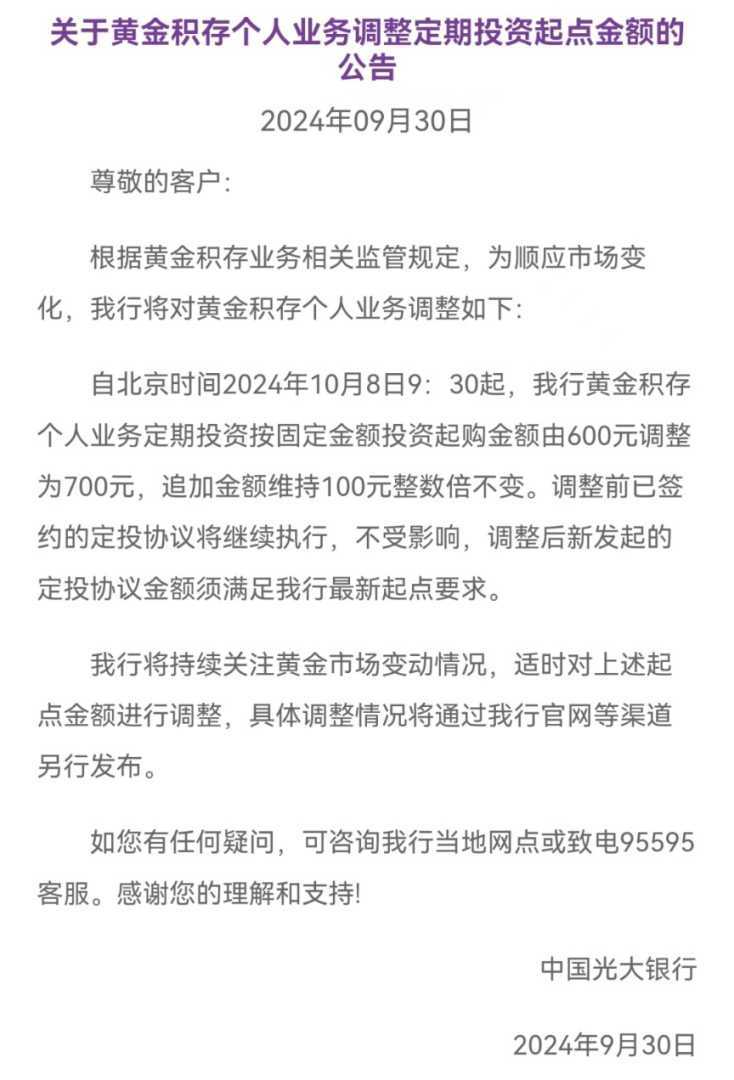自10月中旬以来,交通银行、光大银行、工商银行、中国银行、建设银行等多家银行相继发布公告,将黄金积存业务的起点金额上调至650元至700元不等。其中,交通银行自10月18日起,将贵金属钱包、黄金定投业务积存计划交易起点金额由600元调整至700元;光大银行自10月8日起,将黄金积个人业务定期投资按固定金额投资起购金额由600元调整为700元;工商银行自10月1日起,将如意金积存业务最低投资额由550元上调至650元。此外,农业银行、兴业银行、浙商银行、招商银行等多家银行也于9月下旬至10月初期间宣布上调积存金起购点。
