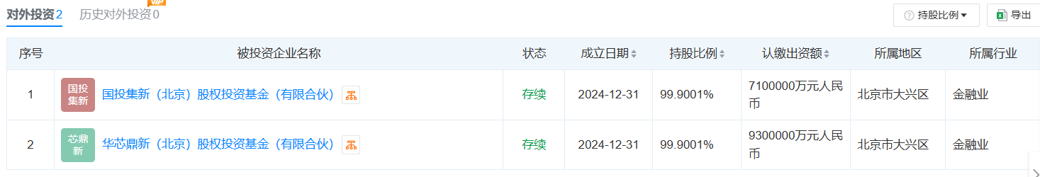 国家集新(北京)股权投资基金(有限合伙)同样于2024年底成立,国家大基金三期投资710亿元,持股99.9001%。国投创业(北京)私募基金管理有限公司(简称“国投创业北京”)作为另一出资方,投资7100万元,持股0.0999%,并担任实际控制人。国投创业北京拥有丰富的半导体产业投资经验。
