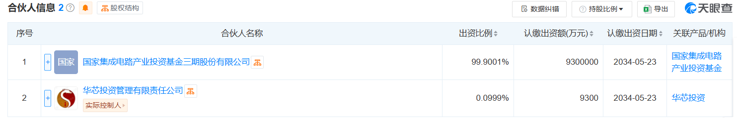 其中,华芯鼎新(北京)股权投资基金(有限合伙)成立于2024年底,国家大基金三期投资930亿元,占股99.9001%,而华芯投资管理有限责任公司(简称“华芯投资”)作为另一出资方,投资9300万元,占股0.0999%,并担任该有限合伙企业的实际控制人。华芯投资同时担任国家大基金一期和二期的基金管理人,参与多起投资事件。