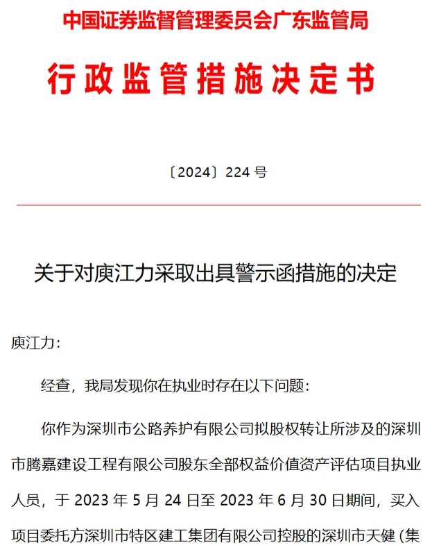 据悉,庾江力作为深圳市公路养护有限公司拟股权转让相关资产评估项目的执业人员,在2023年5月24日至6月30日期间,进行了涉及深圳市天健(集团)股份有限公司(股票代码000090)的股票交易,共计买入并卖出8000股。该交易行为发生在评估工作实际开展至评估报告公开后五日内,严重违反了《中华人民共和国证券法》的相关规定。