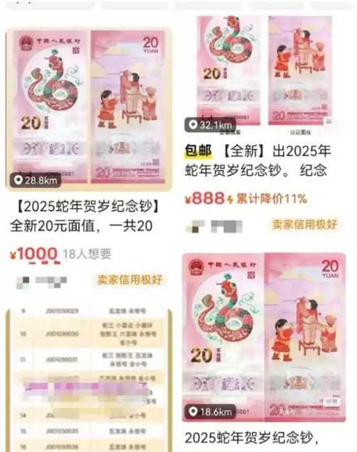中新经纬在二手平台查询发现,一套蛇年纪念钞的价格普遍在800元至1000元之间,与发行价格(一张20元,一套400元)相比,溢价幅度高达100%至150%。一位卖家表示,他早上刚从银行取回了20张蛇钞,正在考虑出售价格。