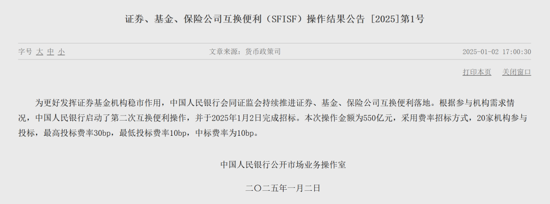 自首次试点以来,互换便利操作持续稳步推进,并在近期实现了扩围降费。2025年1月2日,中国人民银行宣布成功完成了第二次互换便利操作,操作金额高达550亿元,相较于首次操作规模有所扩大。