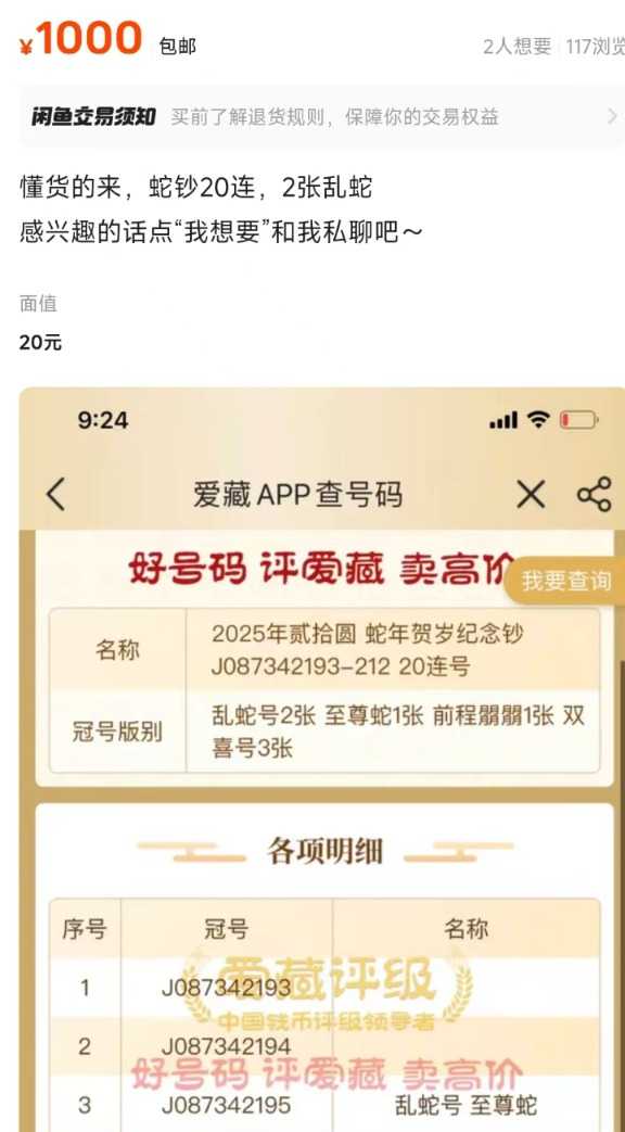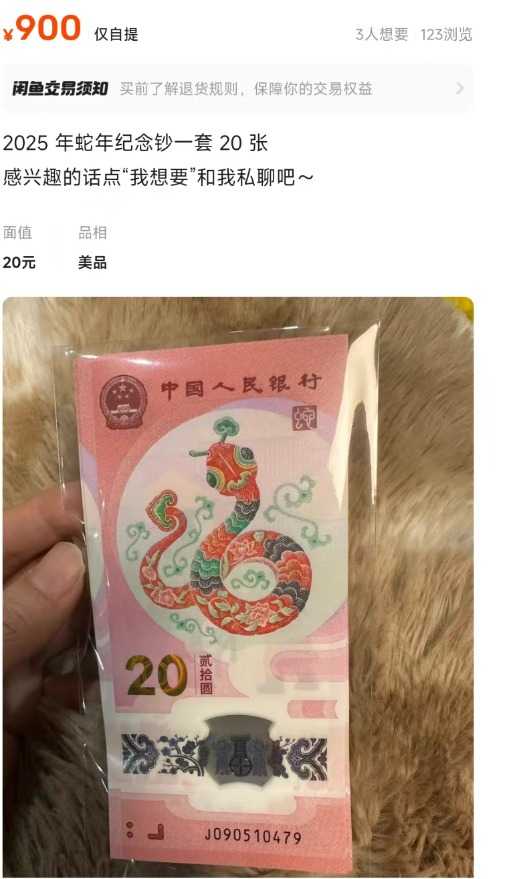 记者通过二手平台查询发现,蛇年纪念钞的价格普遍在800元至1000元之间,相较于其400元的发行价,溢价幅度已超过100%。这一波“蛇钞”行情不仅激发了市场的热情,还带动了二手平台上“蛇币”“蛇钞”的火爆交易。