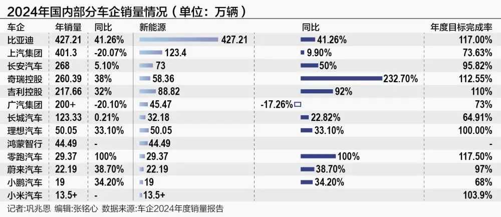 2024年车市加速洗牌,在“以旧换新”政策的支持下,我国新能源汽车年度产销均首次突破1000万辆大关,新能源乘用车渗透率连续多月突破50%。比亚迪问鼎销冠,吉利、奇瑞全年销量再破纪录;理想成为首个达成年交付50万辆的新势力品牌;小米等新势力品牌也迅速崛起。