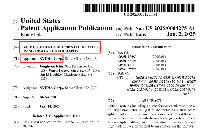 日前,英伟达在美国专利及商标局官网正式公布了一项AR眼镜专利——“无背光增强现实数字全息技术”(专利号US20250004275A1)。