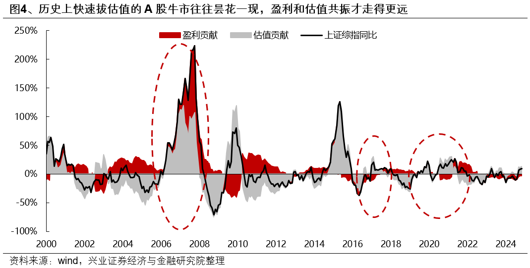 中长期维度,行情持续需盈利支撑,市场审美从估值驱动回归盈利驱动。历史上牛市需盈利与估值共振。本轮3、4月份是行情能否转向盈利驱动的重要观察窗口。该阶段,市场依据政策信号和基本面验证选择方向,评估内需顺周期资产和困境反转类资产能否占优。全国两会明确经济目标和政策力度,加速政策落地。上市公司披露年报和一季报,验证企业基本面改善。中美贸易等外部扰动逐步落地,市场聚焦内部景气修复。